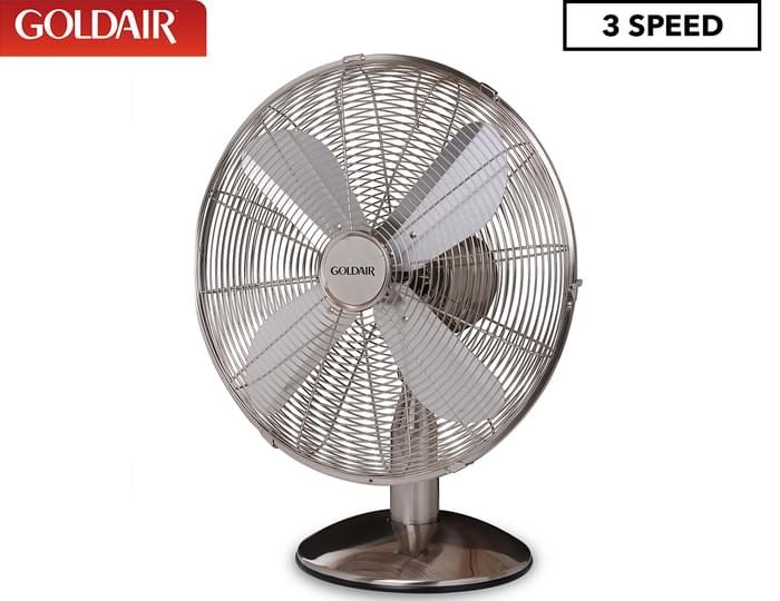 Keep cool when the weather heats up – even in the office – with the Goldair 30cm Satin Chrome Desk Fan. With 3 speed settings for fast, efficient and adjustable cooling, this handy desk fan features a tilt adjustable head, oscillating functionality, and a stylish full metal design with a satin chrome finish for added appeal. Just the thing to keep you cool while you work, game or surf the net.