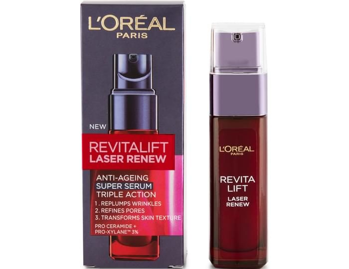 L’Oréal Revitalift Laser Renew Anti-Ageing Super Serum is a highly concentrated triple action formula that works to replump wrinkles, refine pores and transform skin texture. Each application leaves skin looking smoother, firmer and more radiant than ever.